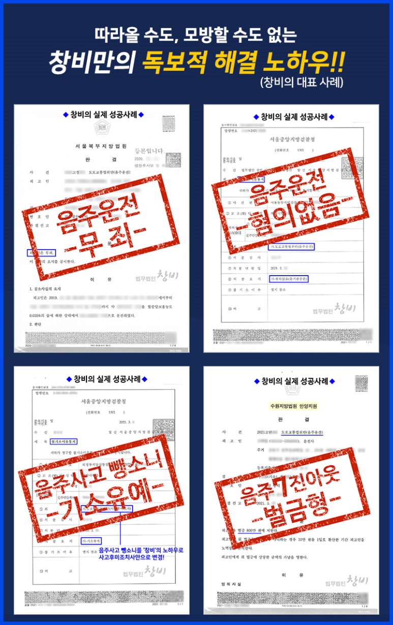 또한 위의 사례처럼 집행유예 기간 중 음주 사고가 발생할 경우 가중 처벌이 불가피하므로 법원을 설득할 수 있도록 동종 사건 경험이 풍부하고 숙련된 부천 음주운전 변호사를 선임하는 것이 중요합니다. 현재 음주운전 적발로 인한 처벌의 위기라면, 음주사건 해결의 최강자로서 실력을 입증해 온 창비의 부천 음주운전 변호사와 함께 전략적이고 체계적인 대응책으로 긍정적인 결과를 도출할 것을 권합니다.