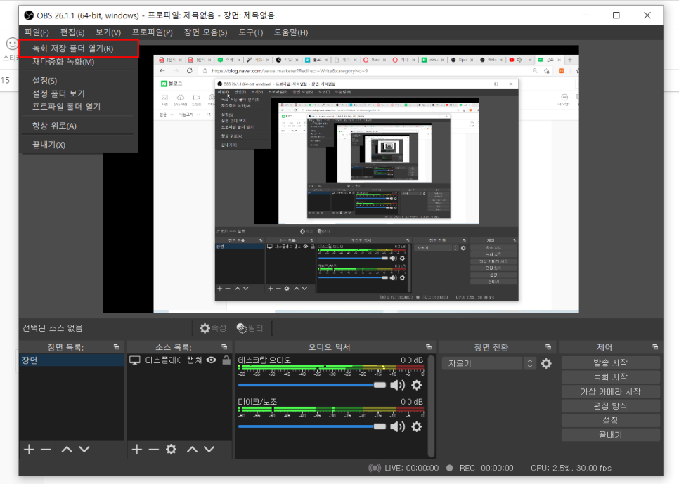 좌측 상단을 보면 파일 녹화 저장 폴더를 열면 나타납니다.