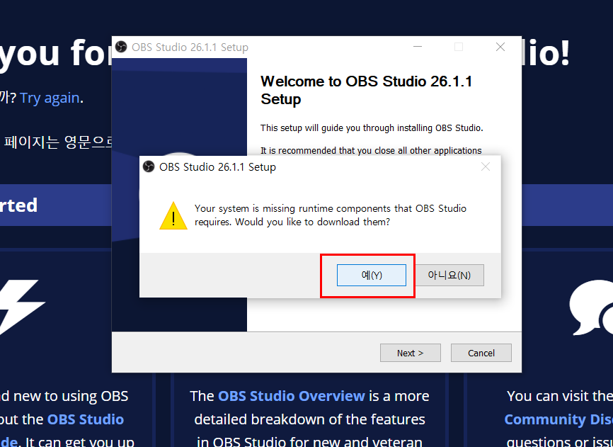 저는 다운받으려고 했는데 Obs 스튜디오를 깔때 다른것도 다운받으라고 해서 “네”를 눌렀더니 새창이 열리게 되었습니다.