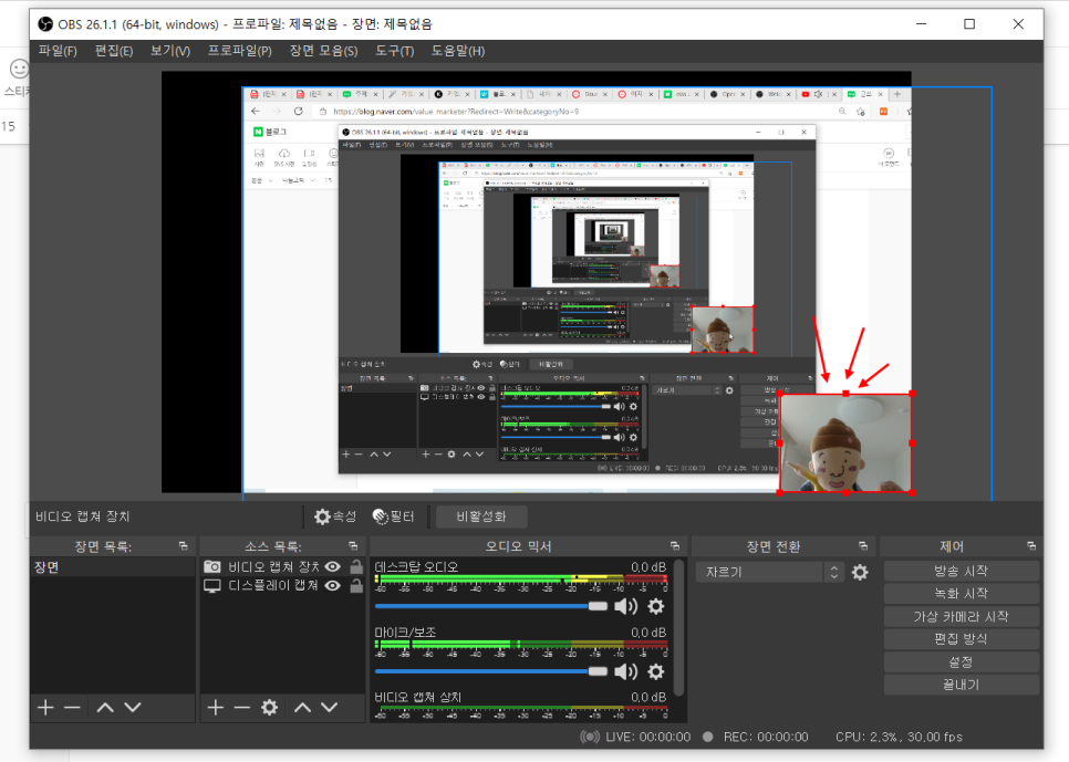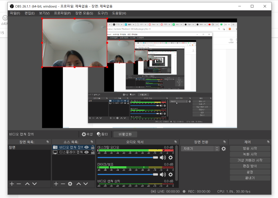 제 얼굴도 한 면에 함께 띄워서 녹화하고 싶다면 참고하면 좋은 방법이죠.♡