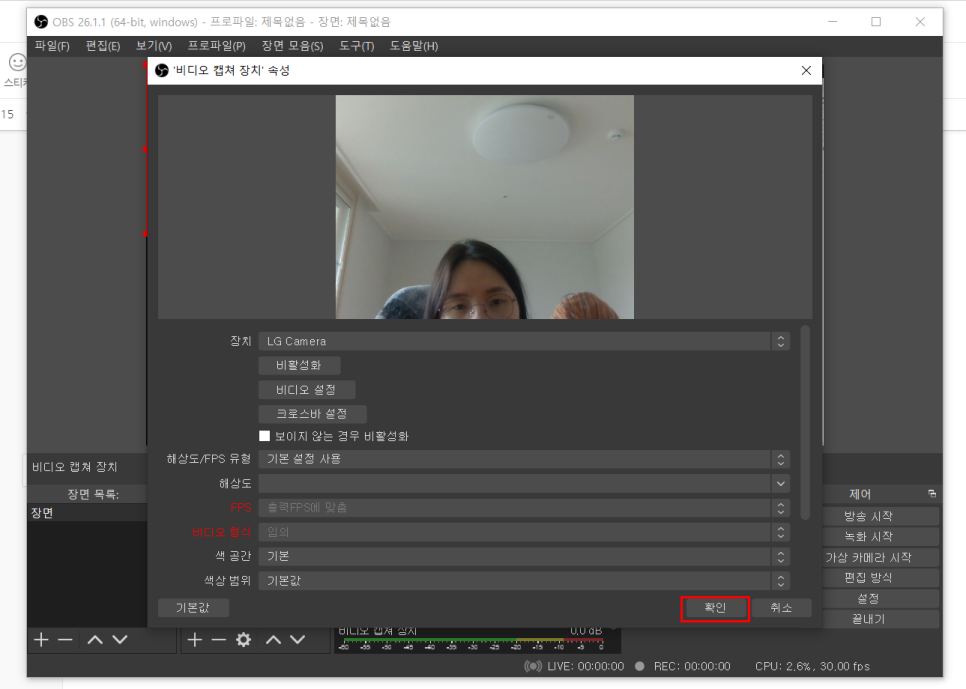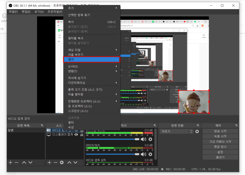 얼굴을 보여주지 않고 녹화하기 위해서는 비디오 캡처장치 마우스 오른쪽 버튼을 누르면 제거 버튼이 나타납니다.저것만 누르면 제거할 수 있어요.