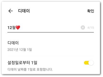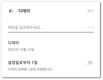 제목, 날짜 그리고 설정일로부터 하루를 설정할지 결정할 수 있습니다 예를 들기 위해 저는 제목을 12월로 잡은 후 디데이 날짜는 12월 1일로 지정했고 설정일로부터 하루를 체크했습니다.