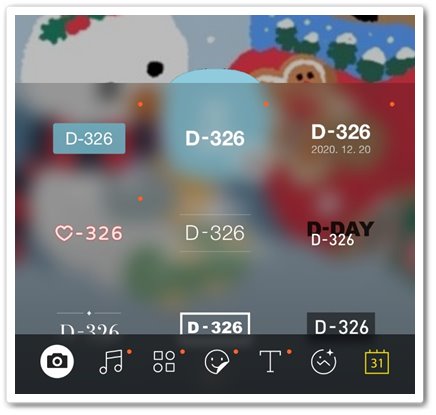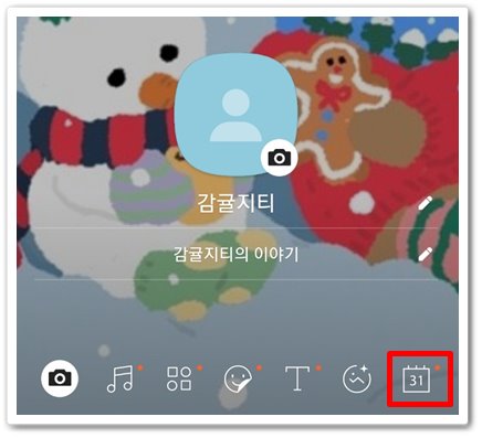 카카오톡 디데이 설정도 정말 쉽게 할 수 있어요 먼저 배경사진을 바꾸기 위해서 카메라 모양의 아이콘이 아니라 하단의 맨 오른쪽에 있는 달력모양의 아이콘을 누르세요.
