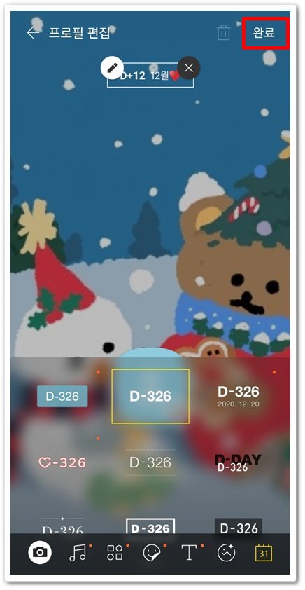 제가 이 문장을 작성했을 당시가 12월 12일이니까 디데이는 ‘D+12 12월♥’이라고 표시되어 있는 게 보이실 겁니다. 표시할 장소도 원하는 위치에 둘 수 있으므로 문자를 눌러 원하는 위치에 놓은 후 오른쪽 상단의 ‘완료’를 클릭합니다.