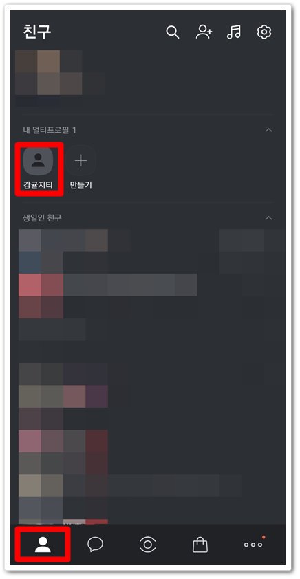 먼저 카카오톡에 들어가신 후 왼쪽 아래 사람 모양의 아이콘을 클릭하신 후 내 프로필 아이콘을 클릭하시면 됩니다.