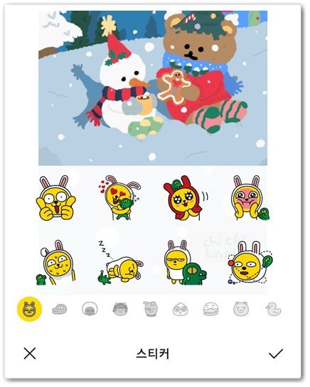 또한 아까 설명 드렸던 스티커의 경우 해당 아이콘을 클릭하면 위와 같은 이모티콘을 볼 수 있으며 원하는 이모티콘을 누른 후 원하는 위치에 배치시킬 수 있습니다.