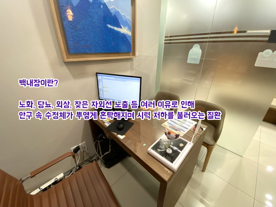 균의 수명이 높아진 오늘날 남녀 불문하고 잘 알아 두지 않으면 안 되는 질환이 있습니다. 일부에서는 노안과 같은 증상으로 간주하는 경우가 많습니다만, 부르는 명칭일수록 전혀 다른 것입니다. 노안은 수정체의 탄력이 약해지고 조절력이 약해져서 생기는 증상입니다. 그러나 백내장은 투명성과 청결을 유지해야 하는 수정체가 여러 원인에 의해 탁해지고 시야가 흐릿해 보이며 시력까지 저하되는 실명질환입니다.