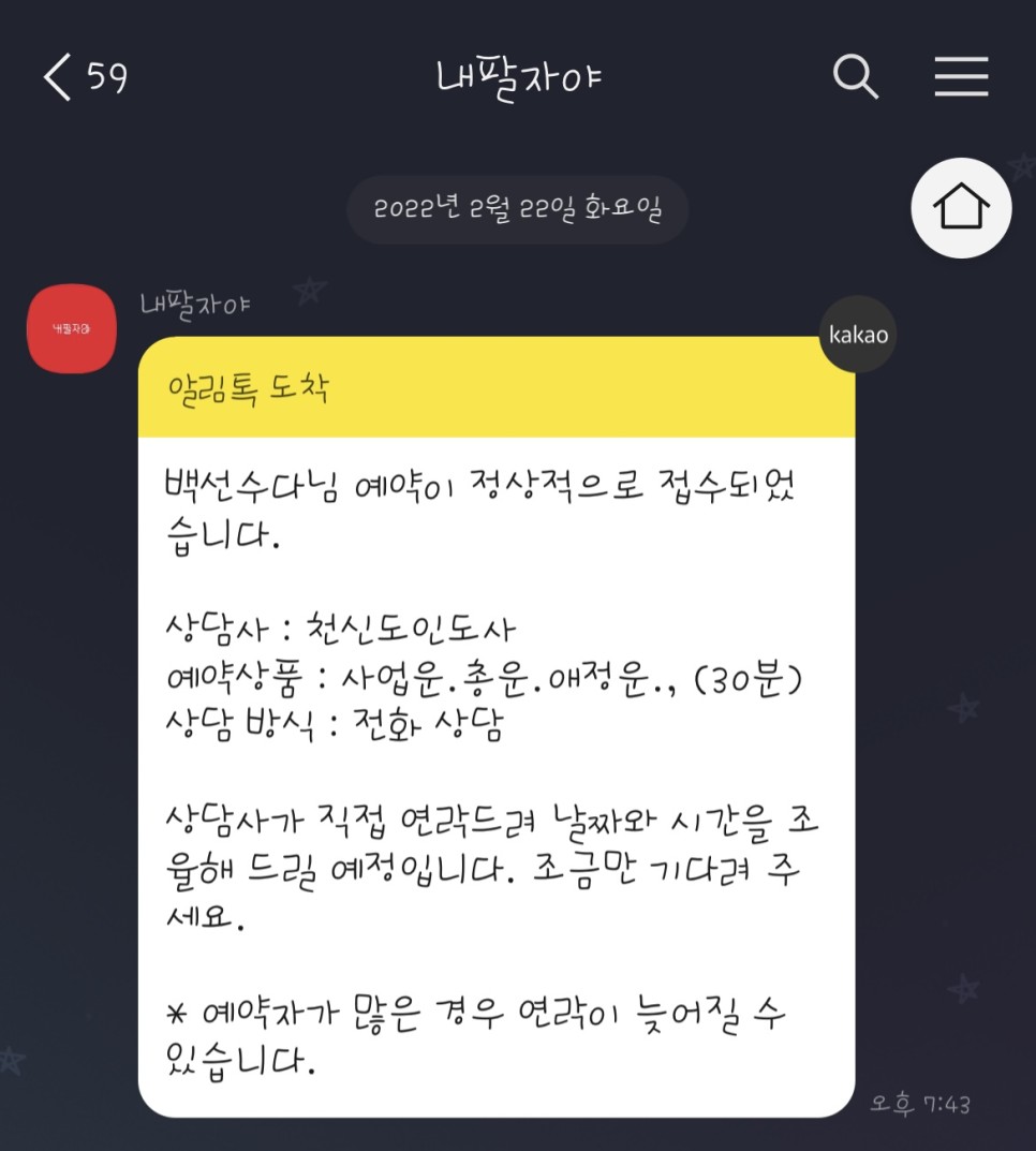 예약을 완료하면 이렇게 카톡으로 문자가 온다 그리고 전화가 온다!