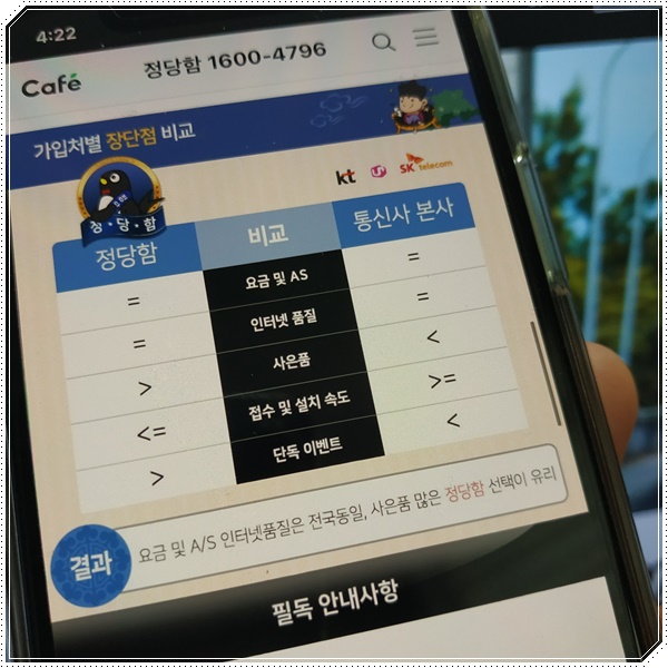 제가 가입한 곳은 인터넷 비교사이트 정당함인데 아까 말씀드린 3가지 조건을 모두 갖추어 3사 통신사 비교도 쉽고 상담도 편리했지만 설치 당일 선물을 받을 수 있었던 곳이라 많은 분들이 재사용하는 곳이라고 합니다.