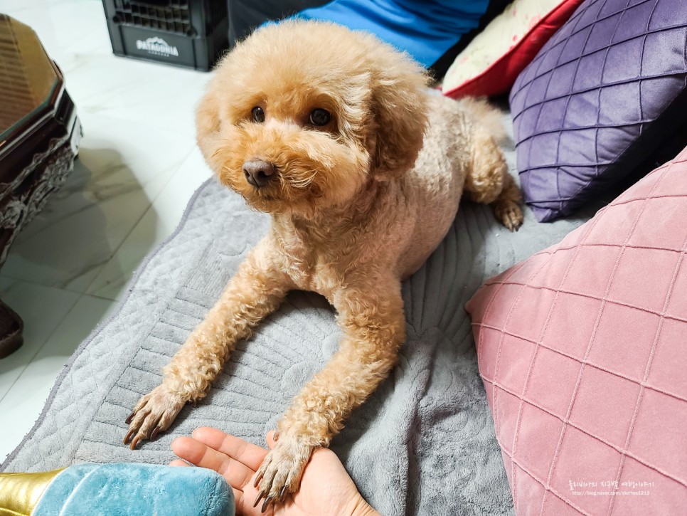 그리고 이때 중요한 것은 이렇게 식사 알레르기를 치료하기로 마음먹는 순간부터 치료기간에는 사료와 물 이외에 아무것도 주지 말아야 한다는 것입니다. 간식은 물론 영양제나 심상충제 등 절대로 먹이지 말라고 했습니다. 근데 간식을 너무 좋아하는 강아지들에게 이건 정말 어려운 일 같아요. (웃음)