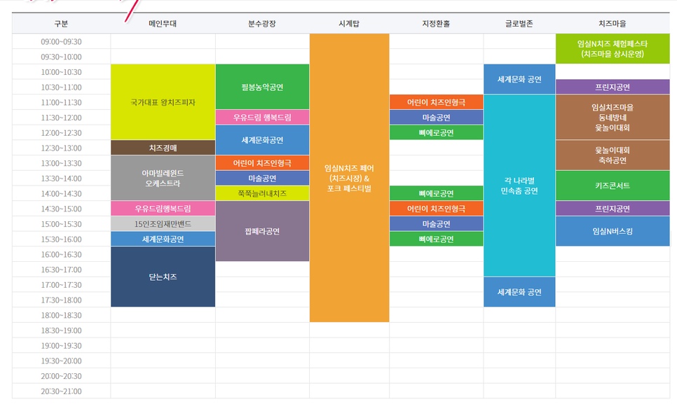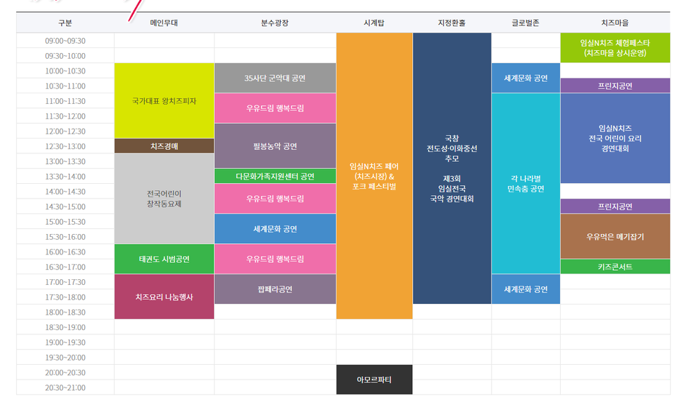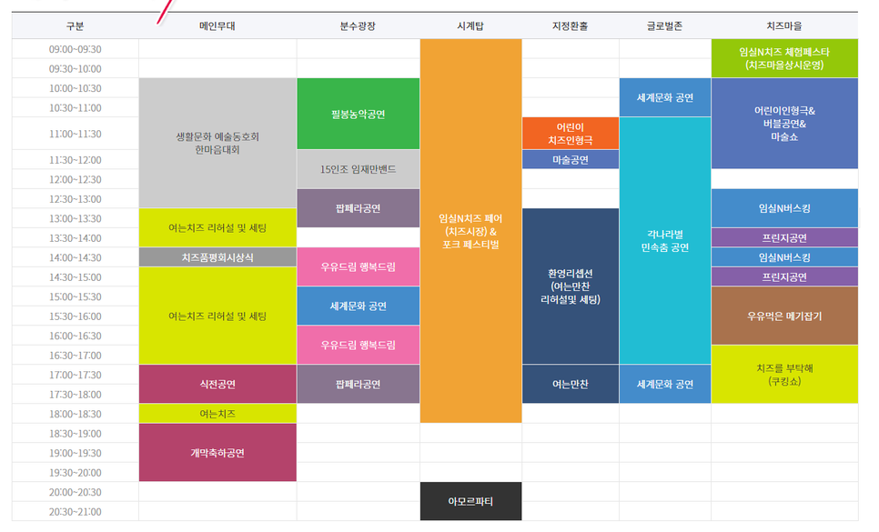 임실치즈테마파크는 임실N치즈체험관, 임실치즈박물관 홍보관, 프로마쥬레스토랑, 유가공공장, 농특산물매장, 임실치즈과학연구소를 갖추고 다양한 볼거리, 즐길거리가 있는 놀이문화공간입니다.임실치즈테마파크 입장료는 무료이며 주차비도 무료입니다.축제는 사진처럼 9개의 테마로 84개의 프로그램이 운영되며 체험료는 체험에 따라 유료체험과 무료체험으로 나뉩니다.임실치즈페스티벌 첫날 일정 중 주목할 만한 것은 개막식과 개막식입니다.항상 글을 쓰면서 축제는 첫날에 가면 볼거리도 많다고 했었는데 올해는 토요일에 갈 생각이에요.토요일에도 행사가 많으니까 힘을 주고 위로해 보겠습니다첫날 일정 중 가장 눈에 띄는 일정은 뭐니 해도 개막 축하공연에 미스트룩의 여왕인 동시에, 뽕 뽑기에 가세하는 송가인씨가 나온다는 것입니다.많은 분들이 기대하고 계실 텐데 못 가서 아쉽네요.