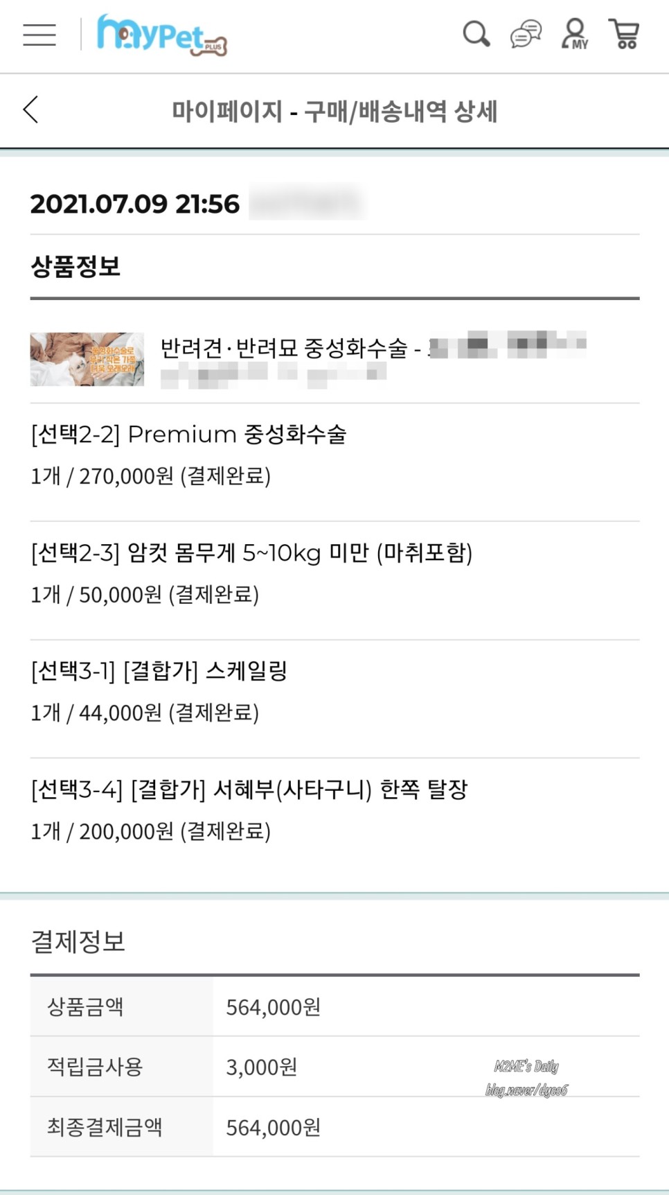 저희는 564,000원을 결제하시고 수술을 받으셨으며,