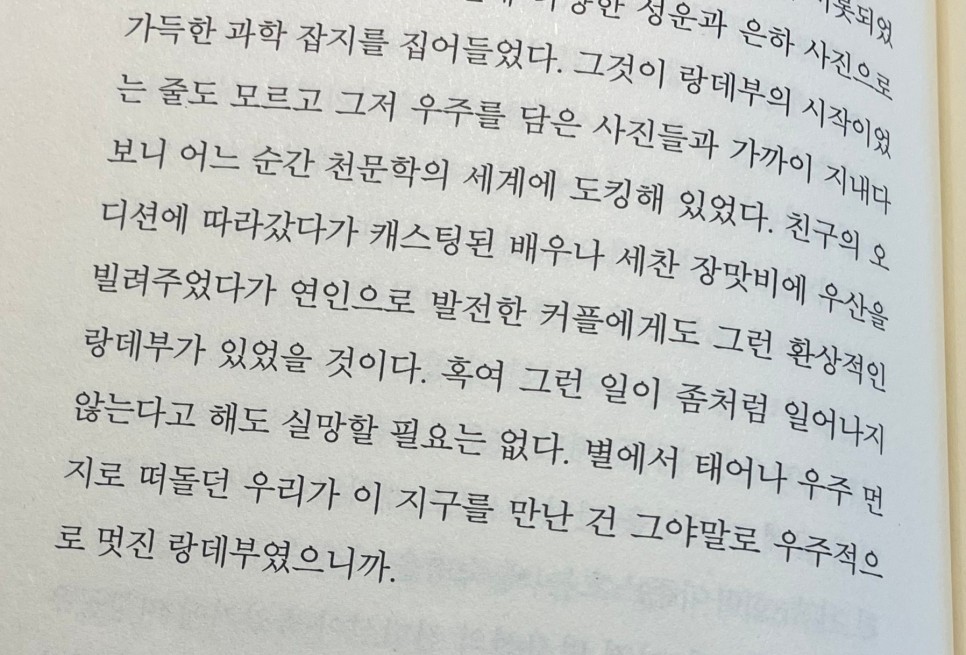 어찌된 일인지 천문학과 도킹했다는 표현이 너무 좋아서 저장생각해보면 내 인생도 어찌된 셈인지 찾아온 운명적인 랑데부의 집합이 아니었나 싶다. 그래서 지금의 직업과 환경에 도킹한 것은 아닐까-마지막 문장도 멋지다.별에서 태어나 우주의 먼지로 방랑하던 우리가 이 지구를 만난 것은 그야말로 우주적으로 멋진 랑데부였기 때문이다.