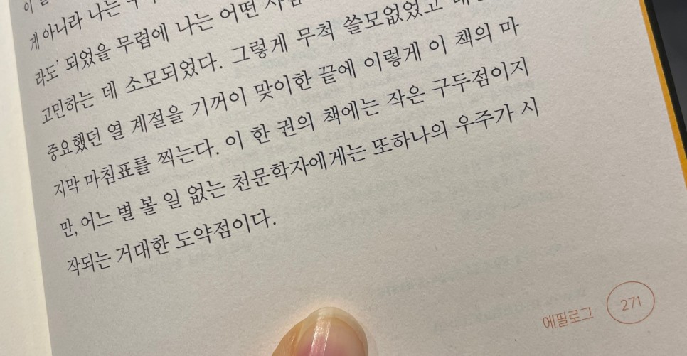 이 한 권의 책은 작은 구두점이지만 어떤 의미도 없는 천문학자에게는 또 하나의 우주가 시작되는 거대한 도약점이다.아, 읽을 때도 소름 돋았지만 또 타이핑 칠 때도 소름이 돋는 문장이야. 마치 닐 암스트롱의 명언을 오마쥬한 듯한 문장 이것은 한 인간에게는 작은 발걸음이지만 인류에게는 위대한 도약이다 1969년 7월 20일 미국의 우주비행사 닐 암스트롱이 달의 고요의 바다에 첫발을 내디디며 한 말이 책의 에필로그까지 작성하면서 마지막 마침표를 찍으면서 정말 말 그대로 고요의 바다에 첫 발을 내딛고 있는 것 같다. 그래서 지금 박사님께 열려진 또 다른 우주가 어떤 우주인지도 묻고 싶다. 이미 베스트셀러 작가가 돼 많은 이들의 주목을 받고 있지만 앞으로 어떤 계획을 갖고 있는지 알고 싶은 것 투성이다.