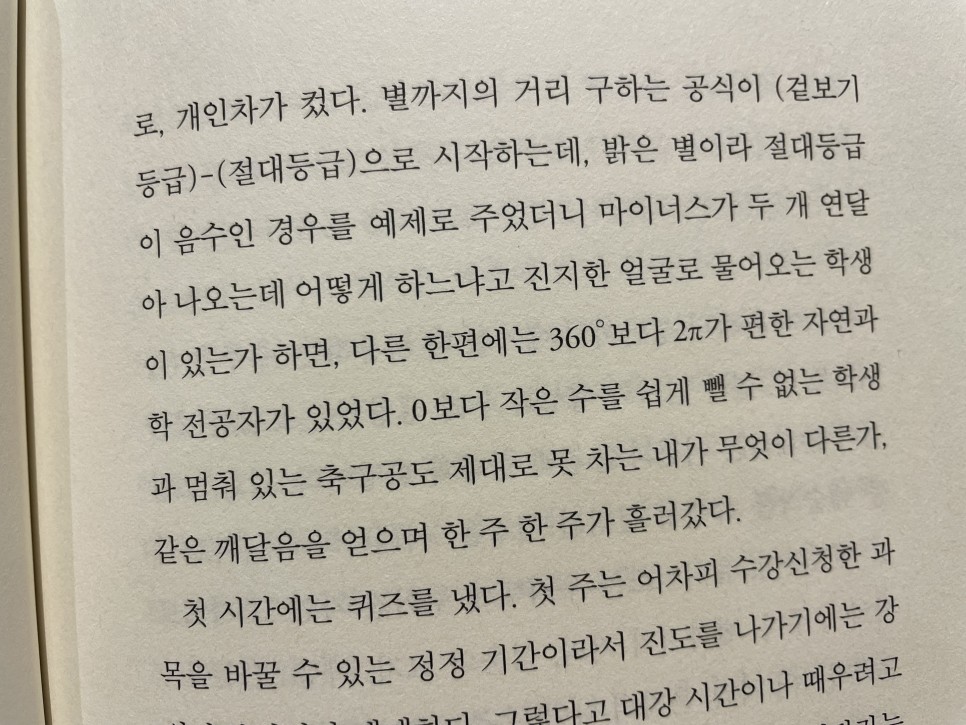 저자가 시간강사로 활동하면서 우주의 이해라는 교양수업을 했던 경험담도 정말 유익했다. 자연계가 아닌 예체능계, 인문계 수강생의 비율이 더 높았다는 점이 내게도 너무 신기했다. 그리고 저자만의 과제를 주는 방식도 마음에 들었다.참교육자라고 생각했다.특히 아래 글은 뼈에 새기고 싶을 정도로 나에게 유익하고 충격적인 글이었다.