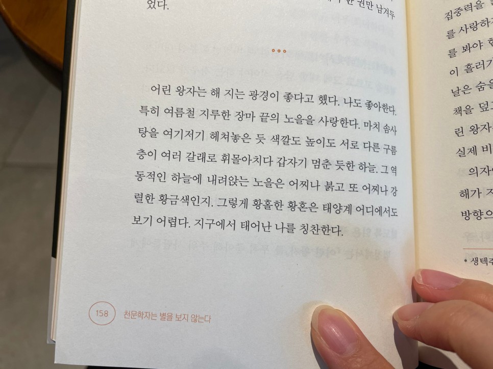 이 책이 처음 신간으로 나왔을 때부터 관심이 있었어 그래서 학교 도서관에도 신청해 놨지만, 계속 볼까- 그만둘까 하다가 미뤄왔다. 뭐랄까 제목이 마음에 들었는데 대충 훑어봤을 때, 에세이 같았는데 어떤 주제를 중심으로 한 에세이인지 잘 몰라서 당황했다.또 천문학자는 아니지만 천문학을 어느 정도 공부한 사람으로 저자가 말하는 ‘천문학자는 별을 보지 않는다’는 문장이 어떤 의미인지도 정확히 알 수 있을 것 같아 사실상 이 책의 첫인상은 ‘새로움’보다는 ‘익숙함, 공감’을 느끼고 싶을 때 읽는 책. 였다.