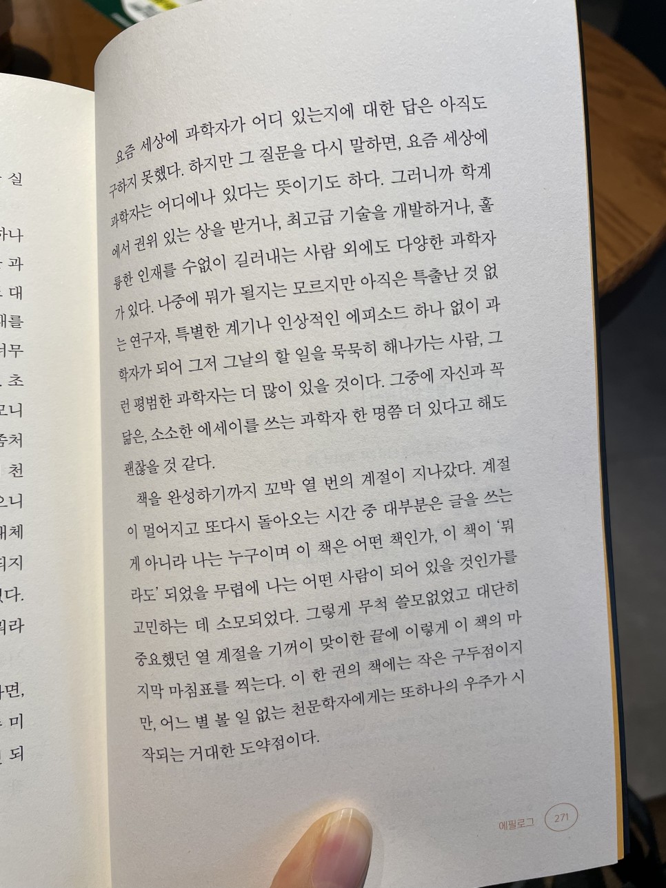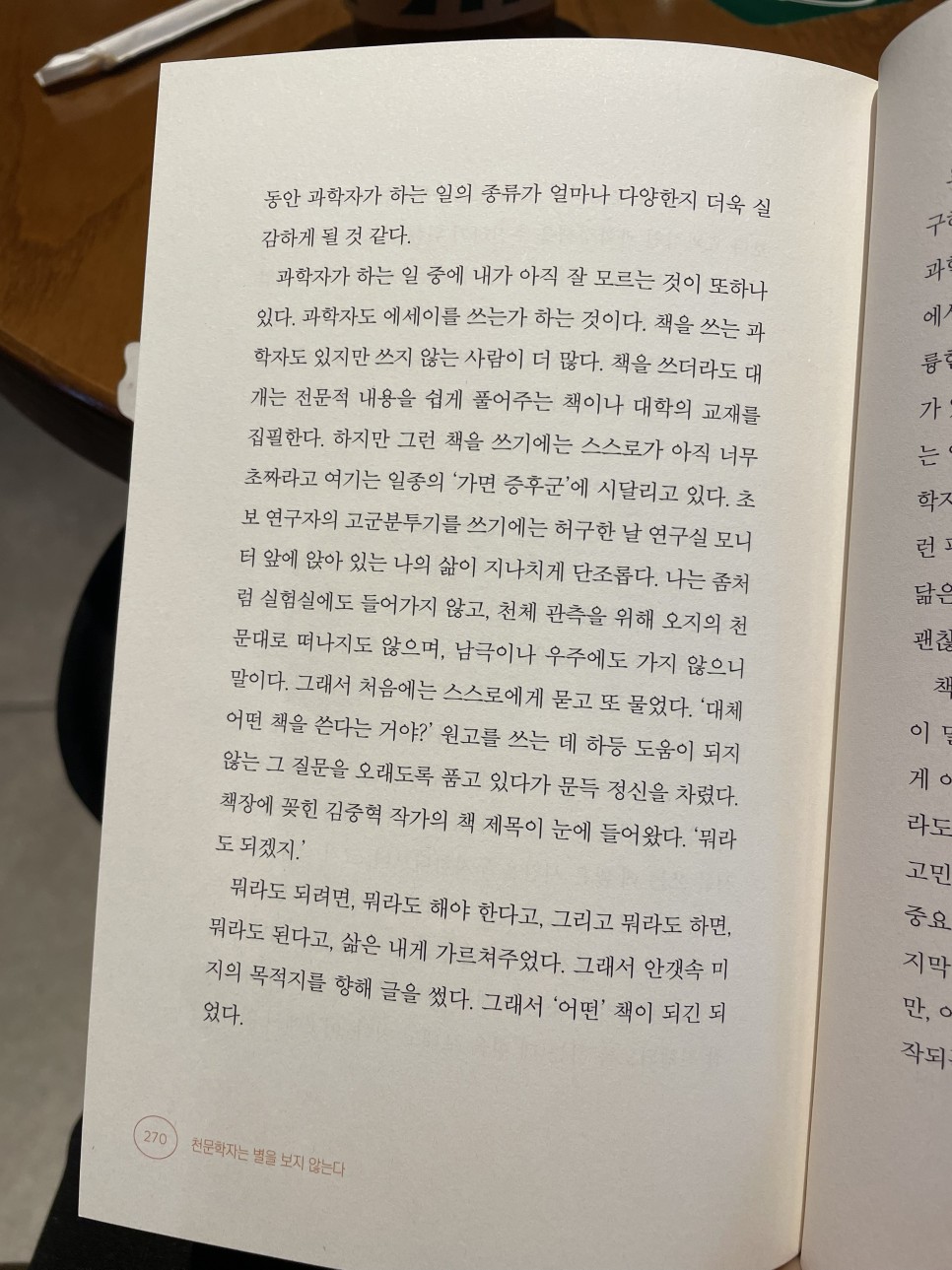 사실 이 두 페이지가 레전드 오브 레전드다. 처음 한 장에서 대학원 파트를 읽었을 때는 나도 모르게 부러워한 나머지 책은 너무 재미있어서 이건 꼭 서평을 써야만 한다!는 생각이 들었다. 하지만 갈수록 (특히 천문학 내용이 나올수록) 서평을 어떻게 써야 할지 막막하고 의지가 약해져 쓸지 고민하기 시작했다. 그러다가 이 책의 마지막 장을 읽자마자 이건 무조건 남겨야겠다. 그리고 페이지를 통째로 찍어놨어도대체 무슨 책을 쓴다는 건가? 원고를 쓰는 데 아무런 도움이 되지 않는 그 질문을 오랫동안 품고 있다가 문득 깨달았다. 책장에 꽂혀 있는 김준혁 작가의 책 제목이 눈에 들어왔다. “무엇이 되겠지.” 무엇이 되려면, 무엇이든 해야 한다고, 그리고 무엇이든지 하면, 무엇이 되겠다고 내게 가르치셨다.그래서 안개 속 미지의 목적지를 향해 글을 썼다. 그래서 어떤 책이 될 수는 있었다.솔직히 이 책의 전체 주제? 라고 말하면 뭐라고 해야 좋을지 감을 잡을 수가 없다. 천문학자의 천문학 연구 이야기도 한 스푼, 천문학력사 이야기도 한 스푼, 한 대학원생의 회고록 한 스푼, 누군가의 어머니로서 가정을 위한 그녀의 정성 한 스푼, 과학 연구를 위한 과학자의 열정 한 스푼 등등. 이 책에 실린 내용은 생각보다 많아. 그러나 그 모든 것이 심채경의 솔직함으로 무장되어 그의 에세이로 나오게 된 것이다. 이 책을 정확히 골라 그래서 무슨 책이야?라고 물으면 어느 천문학자의 에세이라고만 표현할 수밖에 없어 답답하다. 에세이는 맞아 근데 그냥 방구석에 있는 일기는 아니야 심채경 박사의 논문 덕분에 행성과학자의 연구에 대해서도 알게 되고 대학원생의 일생에 대해서도 알게 되고, 천문학도 모르고 있던 사람들이 천문학이 무엇인지 알게 되고, 여성 과학자라면 필연적으로 마주해야 할 순간에 대해서도 알게 된다. 그리고 그녀가 소리 내어 이런 책을 세상에 내준 것만으로도 감사하다. 덕분에 또 다른 별이 존재한다는 걸 알게 된 셈이니까.