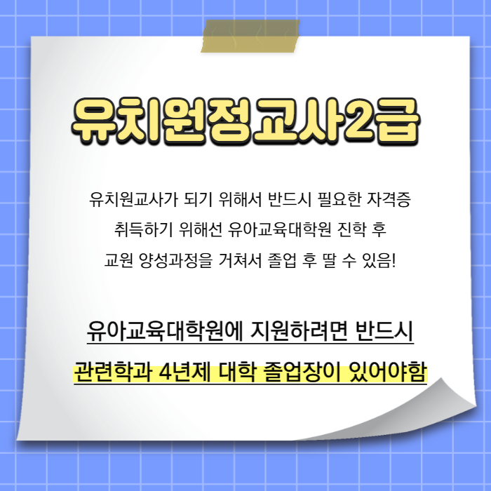 유치원 정교사 2급 자격증을 취득해야 하고, 이 자격은 교직 이수 과목이라는 것을 듣지 않으면 안 되기 때문에, 반드시 교육 관련 대학에 진학하지 않으면 안 됩니다!