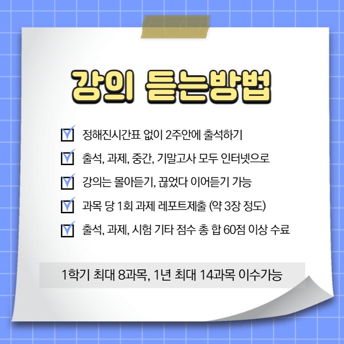 60학점을 온라인 강의로 채우려면 3학기는 걸릴 거예요.1년 반 정도 들어가는데