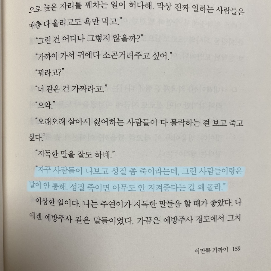 이렇게 가까이를 이렇게 가까이라고 생각하고 검색했더니 책이 없어서 당황했는데, 전세랑 작가의 작품을 구경하다가 발견했어! 휴대전화 메모 앱에 적어두지만 가끔 오탈자나 잘못 읽지 못한 책이 몇 권 있다. 뭐 정말 재미있는 책이라면 언젠가 또 내 귀에 들어올테니까 너무 연연하지마. 시선으로부터나 피프티 피플에서도 느꼈지만 인물 간의 관계를 촘촘히 구성했다. 나였으면… 만들다가 까먹어서 잘못 쓴 게 너무 많았을 거야 나는 설정을 짜는 쪽보다 실수를 찾아내는 쪽이다. 그래서 인물 간의 관계를 잘 기억하지 못하는, 특히 남의 이름도 모르는 나 같은 사람에게는 어렵다. 시선으로부터는 가계도를 올렸지만 나머지 작품에는 없으니까. 하지만 앞의 내용을 찾으면서라도 읽고 싶은 책이라서 읽었다. 정세란의 문장은 그렇다.미대의 이야기를 그리지 않는 웹툰 작가도 드물고, 글 쓰는 이야기를 쓰지 않는 소설 작가도 드물다고 한다. 정세란의 글은 등장인물의 직업이 다양하다. 그래서 더 재밌을 것 같아 매번 엉뚱한 사람이 나와서 엉뚱한 얘기를 하기 때문이다. 작가는 아무나 좋은 게 아니야…