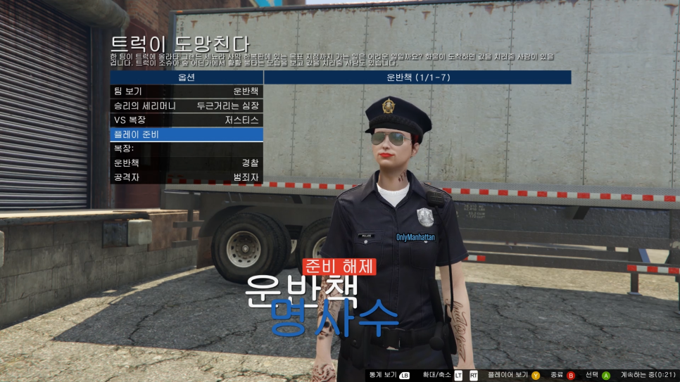 복장을 구하시는 분은 운반책팀에 위치하고 VS 복장을 저스티스로 설정하면 경찰복이 나타납니다.