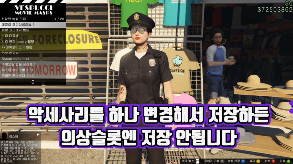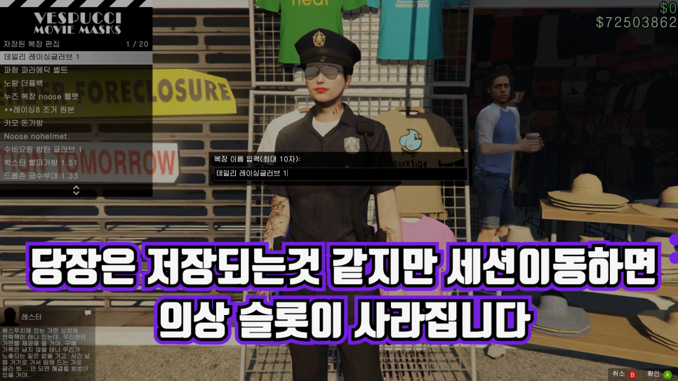 이전 버전처럼 경찰복을 입은 상태에서 액세서리를 하나 변경하는 방법으로도 저장해 보았지만 세션이 이동하면 슬롯에서 사라집니다(장갑, 목걸이, 귀걸이 등 하나 바꾸는 방법도 통하지 않는다).