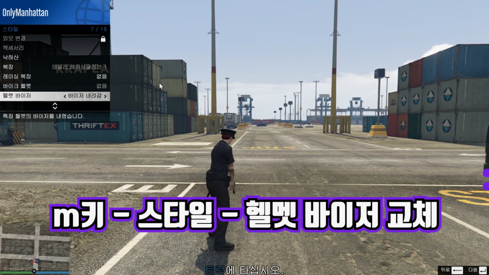 복장을 원하시는 분은 m키 상호작용 창을 열고 스타일-헬멧 바이저를 교환합니다.이때 사용하는 키는 우측방향 키만을 사용하여 교환합니다.교환 작업은 약 15초간 반복되어야 합니다.