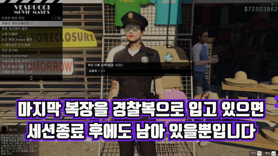 다만 세션 이동이나 종료 전에 마지막 복장을 경찰복으로 입었다면 재접속 후에도 복장이 남아 있지만 사실상 의상 슬롯에 저장되는 것은 아니기 때문에 의미가 없어 보입니다.