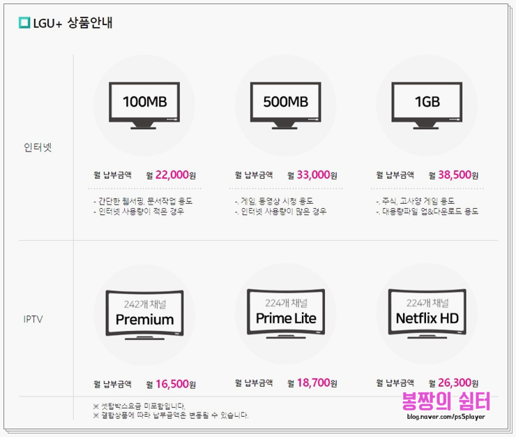 인터넷은 크게 100M, 500M, 1G급으로 나눌 수 있습니다. 당연히 더 클수록 속도가 빨라지지만 요금은 그만큼 비쌉니다. IPTV도 채널 종류, 그리고 넷플릭스 결합 여부에 따라 급이 나뉘는데 개인적으로 조금 투자를 해서라도 넷플릭스 요금제로 가는 게 좋을 것 같네요. 정말 볼거리가 많거든요.