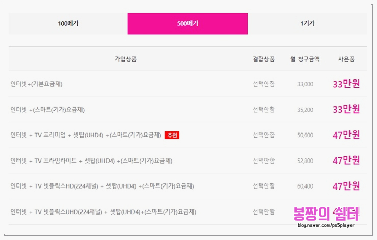 LGU+는 500M 기준으로 단독가입도 사은품이 꽤 크네요. 원래 그렇게 컸나? 아닌 것 같은데… 어쨌든 IPTV를 결합하면 사은품이 좀 더 늘어나는 걸 알 수 있어요.