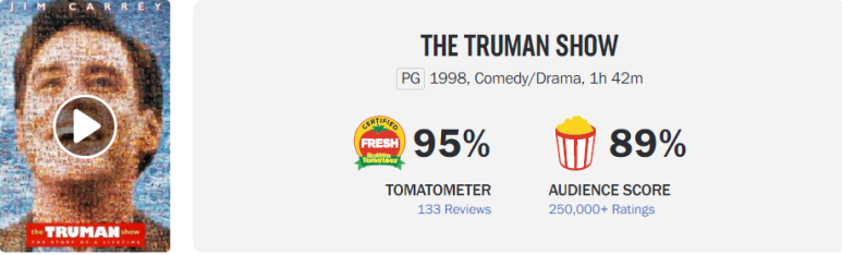 출처 로튼토마토&IMDB 사이트 IMDB에서는 8.1/10의 점수를 로튼토마토에서는 95점의 엄청난 전문가 평점을 자랑하는 코미디 영화를 첫 번째로 소개하는 이유가 있습니다. 오늘 하루 다시는 못 볼 수도 있으니까 하루 치 인사를 할게요 ‘굿 애프터눈 굿 이브닝 굿나잇’이라는 명대사를 남긴 1998년에 개봉되어 벌써 23년이나 지난 고전 명작으로 기록되고 있는 이 영화는 짐 캐리의 주연으로 전 세계 20억이 넘는 사람들이 트루먼(짐 캐리)이 나오는 TV 프로그램을 시청하고 있는 컨셉의 영화입니다.