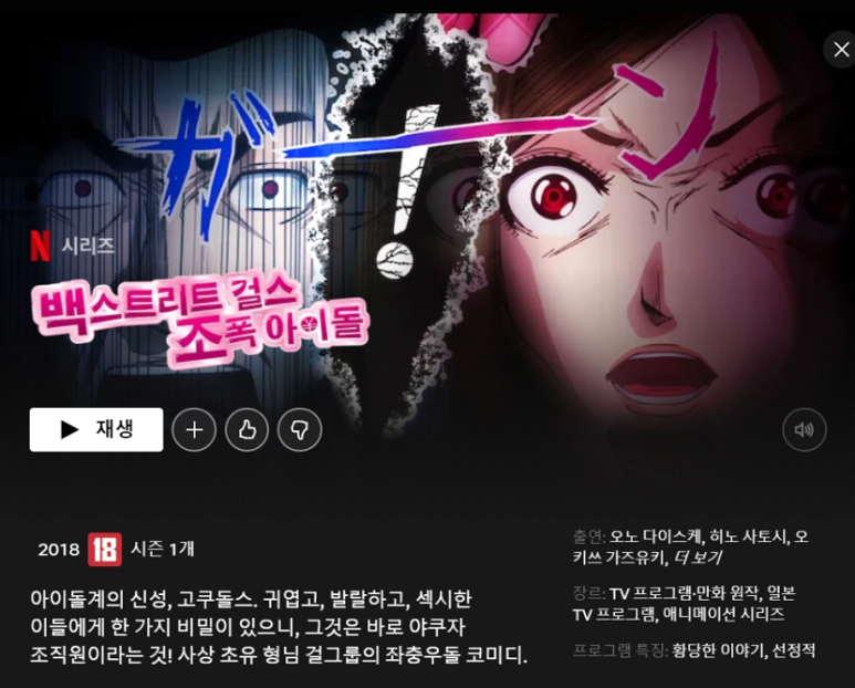 백스트리트가르스 : 극도 아이돌 2018|청불|시즌 1편|텔레비전 프로그램·만화 원작 아이돌계의 샛별, 고쿠도루즈. 귀엽고 발랄하며 섹시한 사람들에게 비밀이 있으니 그건 깡패 조원이라는 것! 사상 첫 형 걸그룹 좌충우돌 코미디. 주연 : 오노 다이스케, 히노 사토시, 오키즈 카즈유키를 무료로 무제한 시청하세요. 30일 무료이용영상 백스트리트걸즈 : 극도아이돌 백스트리트걸즈 : 극도아이돌 : 시즌1 (예고편) 백스트리트걸즈 : 시즌1 예고편 – 탄생! 고쿠돌즈 회차 백스트리트걸즈 : 극도아아아아…www.netflix.com—————————————– 본 포스팅은 소정의 원고료의 지원을 받아 작성하고, 내용은 주관적인 평가를 토대로 작성했습니다——————————————————————————————————————————————————————————————————————–