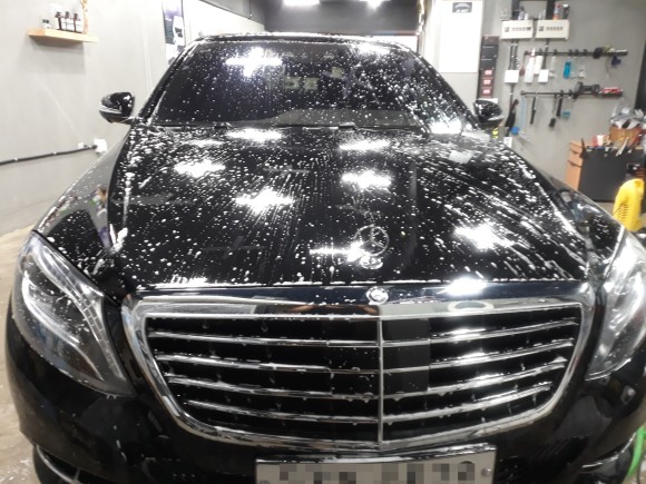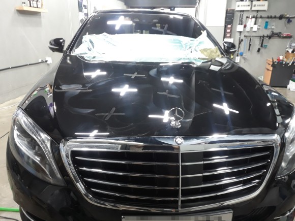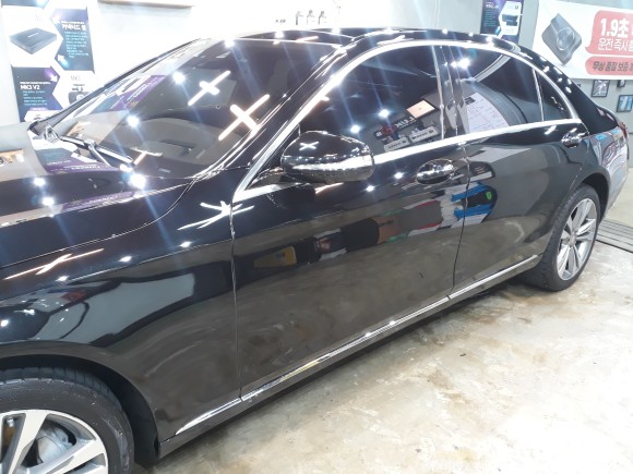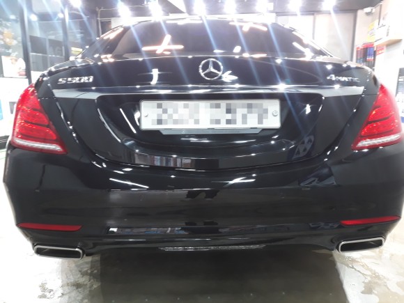 벤츠 S500 차에 대한 광택 작업과 유리막 코팅 시공 작업입니다.