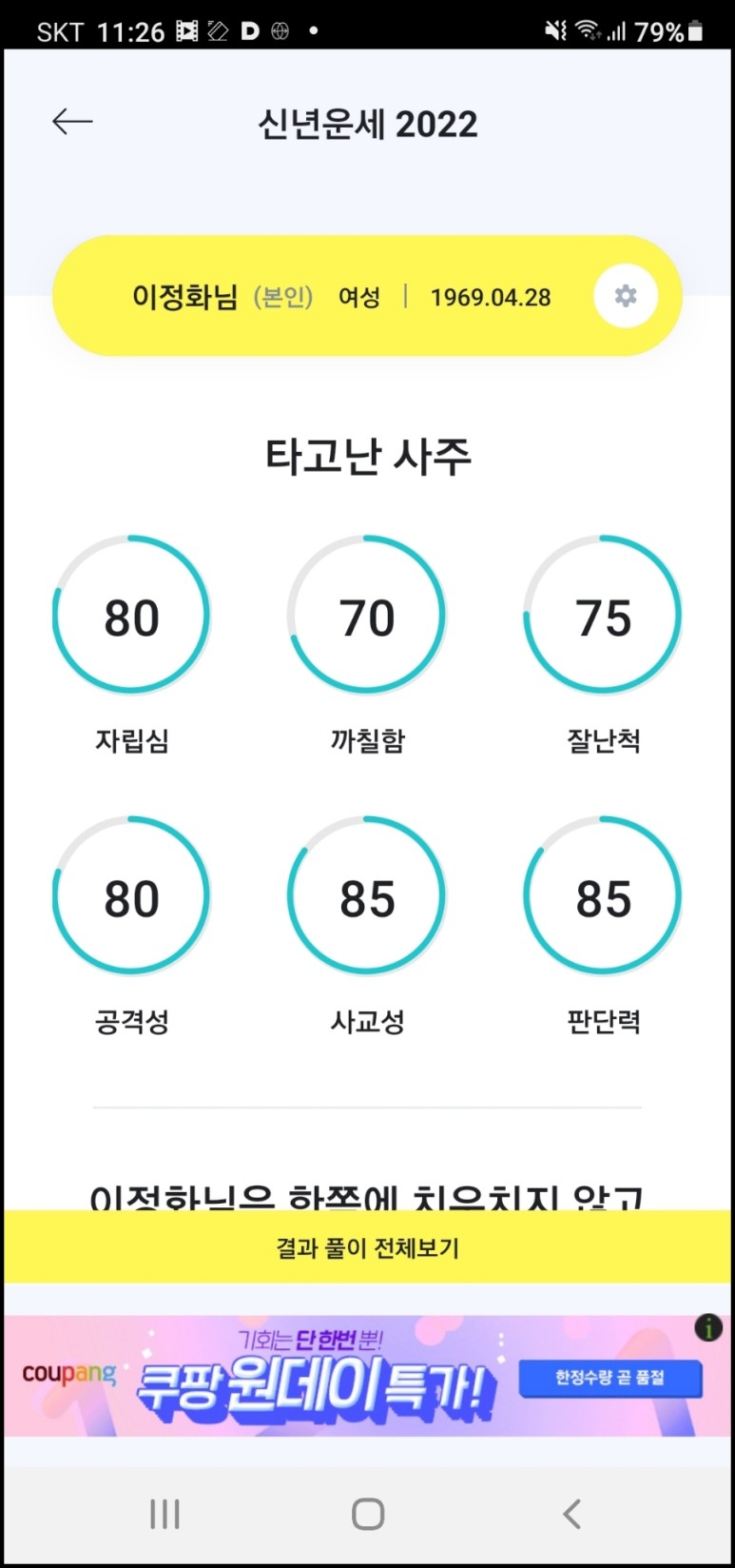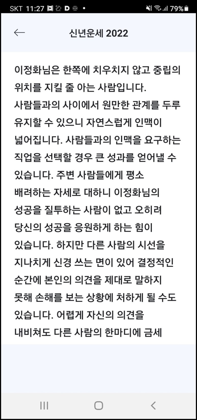 저의 사주는 당연하고 가족이나 지인의 사주를 넣어 새해 운세뿐만 아니라 궁합, 관상까지도 볼 수 있어 새해가 아닌 평소에도 자주 이용하는 앱입니다.