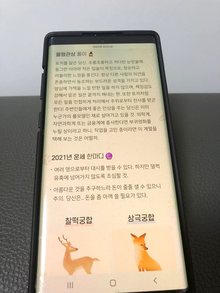 스노우 앱으로 자신의 얼굴을 찍으면 관상이 나오고 동물에 빗대어 나옵니다. 관상해석도 나오고, 2021년의 운세까지 볼 수 있어서 재미있어요!