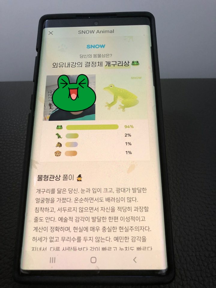 남편에게 테스트 링크를 공유하면 안 된다고 하는데 스노우 앱이 없으면 테스트할 수 없어요. 남편은 개구리 씨 나왔어요!