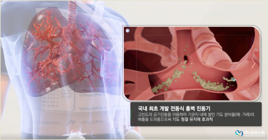 이 기기는 기관지 벽에 대한 다분비물을 떼어내어 입 밖으로 꺼내는 것을 도와줍니다.기침을 해도 가래가 잘 나오지 않는 이유는 분비물이 흉벽에서 제대로 나오지 않았기 때문인데요.흉벽진동기를 이용하여 분비물을 분리하고 공기진동파를 보내어 기침을 자연스럽게 유도하면서 분비물을 역류시켜 배출시킬 수 있습니다.