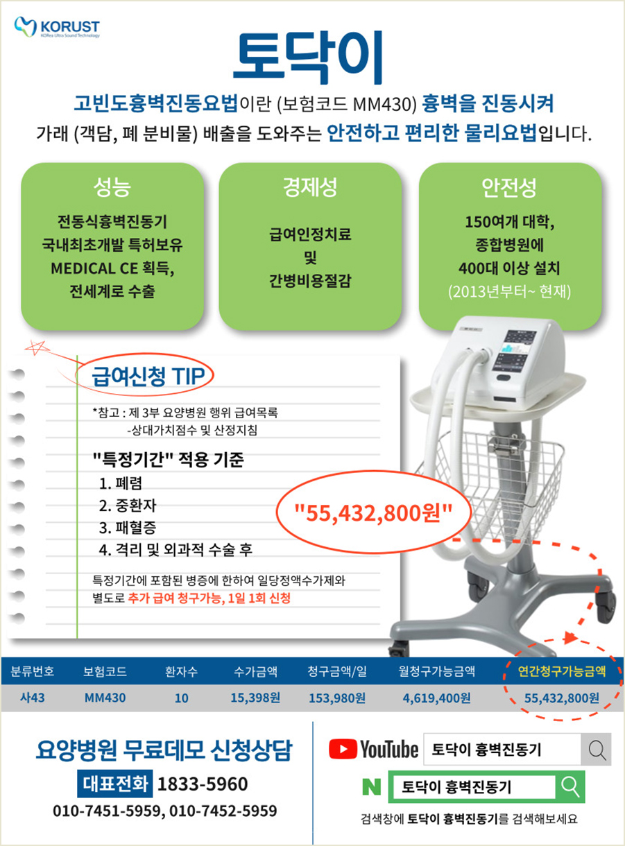 이 제품은 에어베스트와 호스를 연결하고 버튼을 눌러 15분만 설정하면 쉽게 사용할 수 있어 편리하게 사용하실 수 있습니다.특이한 이 장비는 간호인력이 적은 중환자실 등에서 반응이 좋아 대형병원이나 동두천 요양병원에서도 문의를 많이 받고 있습니다시간과 노력을 절약하는 것은 물론, 스스로 관리할 수 있는 톡톡이나 기관지분비물 배출에 사용하는 것도 좋은 방법이라고 생각합니다.편도선이 부으면 음식 섭취도 어려우므로 빠른 치료가 필요하지만, 원인이 되는 가래를 가장 효과적으로 제거 가능한 코라스트 흉벽진동 의료 장비를 사용해 보시기 바랍니다.안녕하세요 코러스입니다 고속성장사회 그리고 의학발전으로 인해 평균수명이 점차 늘어나고 있다… blog.naver.com