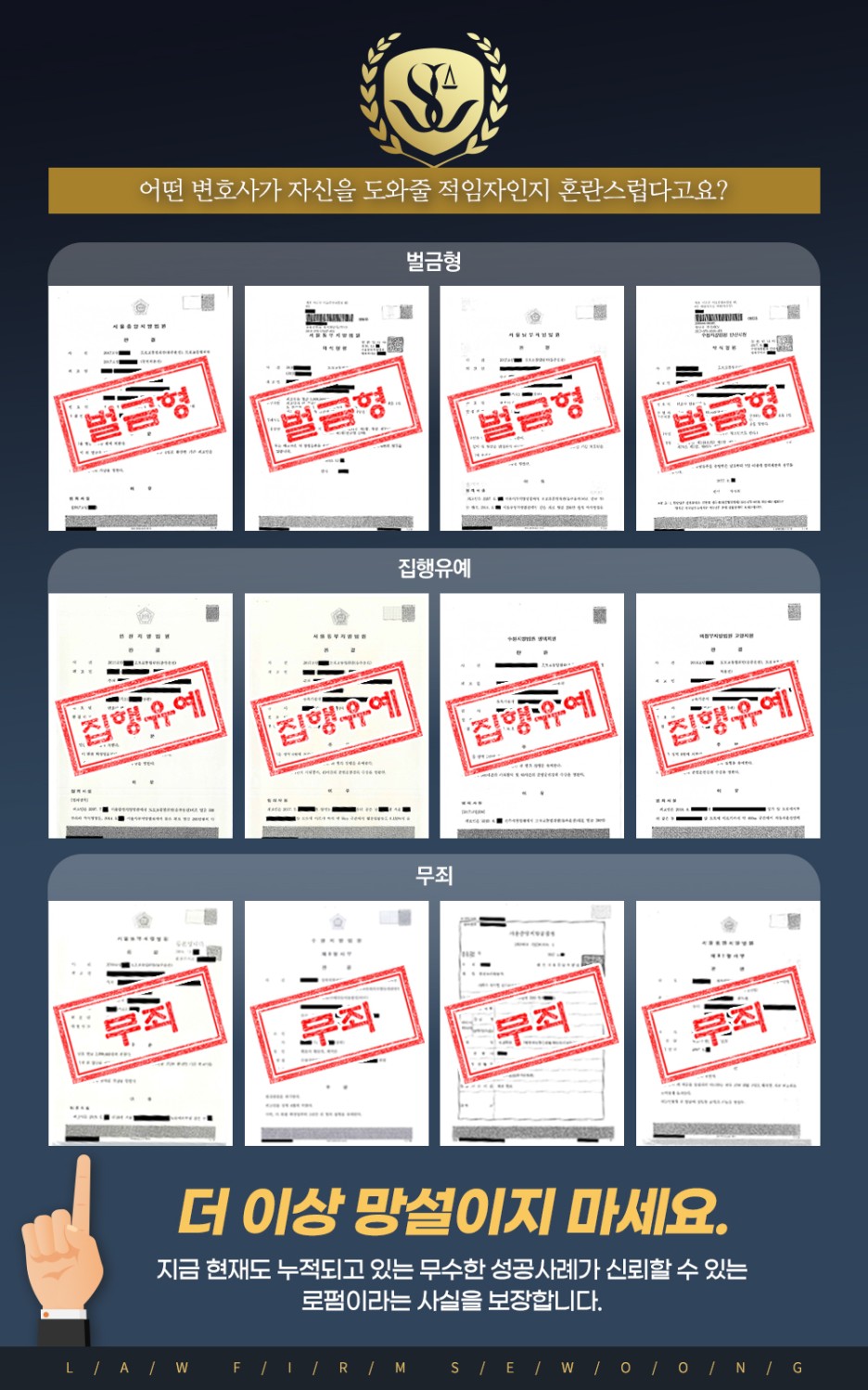 결국 법원은 그동안의 좋지 않은 행적을 감안하면 엄벌이 필요할 수밖에 없지만 마지막으로 개선의 기회를 부여하겠다며 형의 집행을 유예하는 결정을 내렸다고 했습니다. 그가 끝까지 자신의 상황을 정확히 인지하지 못하고 과거처럼 안이한 대처를 했다면 달성할 수 없었던 결과였습니다. 해당 사안은 로펌세은이 운영하는 홈페이지 성공사례 게시판을 통해서도 게시하고 있는 사례인데요. 본인과 유사한 사례임에도 불구하고 무사히 해결된 선례를 확인하고 싶다면 한 번 방문해 보는 것이 좋습니다.