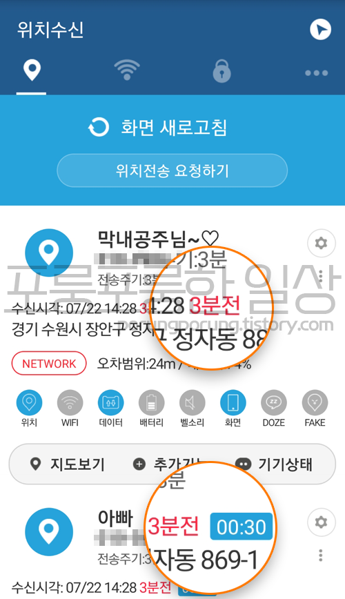 정확히 차량 위치가 표시되고 상세 주소까지 표시되는 것을 앱에서 확인할 수 있습니다.