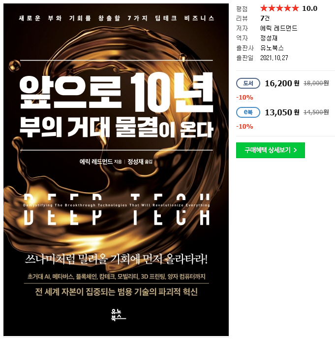 ‘앞으로 10년, 부의 거대한 파도가 온다’라는 책에서는 AI, 블록체인, VR, 3D프린팅 등이 어떤 기술이며 우리에게 어떤 의미로 다가올 것인지를 설명하고 있습니다.