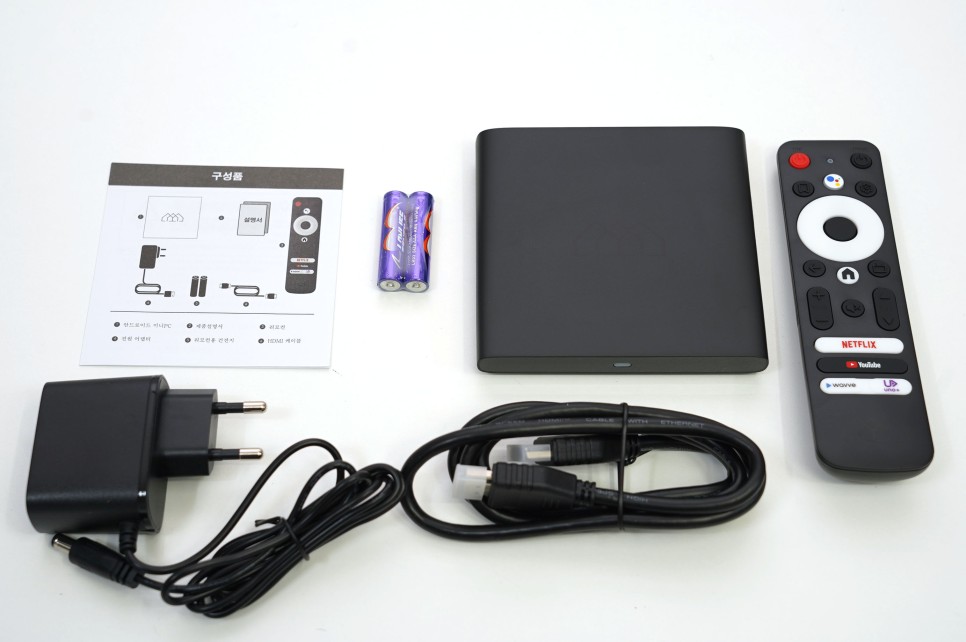 구성품은 본체, 리모콘, 전원 어댑터, 사용 설명서, HDMI 케이블, AAA 건전지 2개가 포함되어 있습니다.