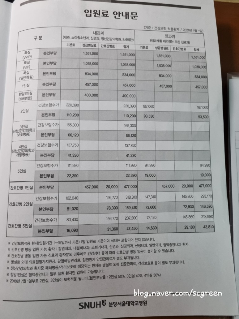 분당서울대학병원 입원분당 서울대병원 입원료는 다음과 같다(*2021년 1월 1일 기준)