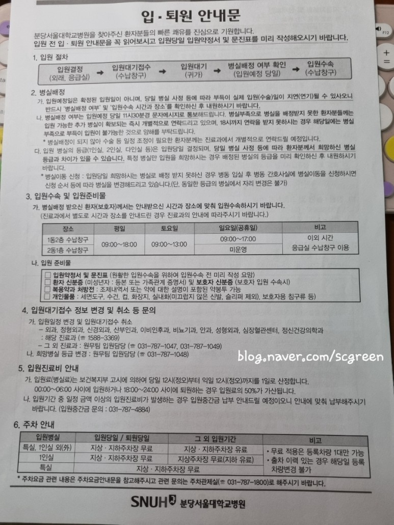 분당서울대병원의 입퇴원 안내문이다.