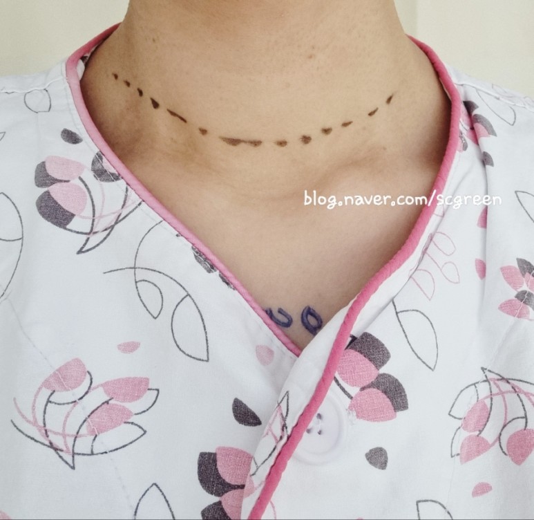 • 교수님께서 수술 전 떼어주신 표지판이지만 물론 이 부위를 모두 절개하는 것은 아니다.이 중 1/3 정도만 절개한다.교수님이 열심히 그림을 그려서 “환자의 목에 주름이 거의 없는데 이 부분에 주름이 잡히는 거예요”라고 말할 때 이제라도 로봇으로 바꿔야 할까?를 골똘히 고민했다.