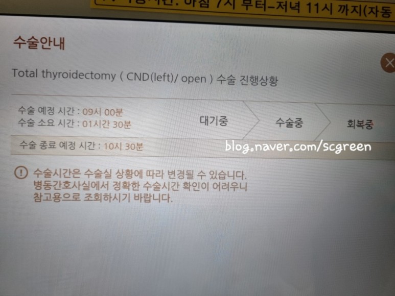 수술 날짜가 되면 LCD 패널에 수술 안내를 받는다.내 수술시간은 1시간 반으로 다행히 첫 번째였다.
