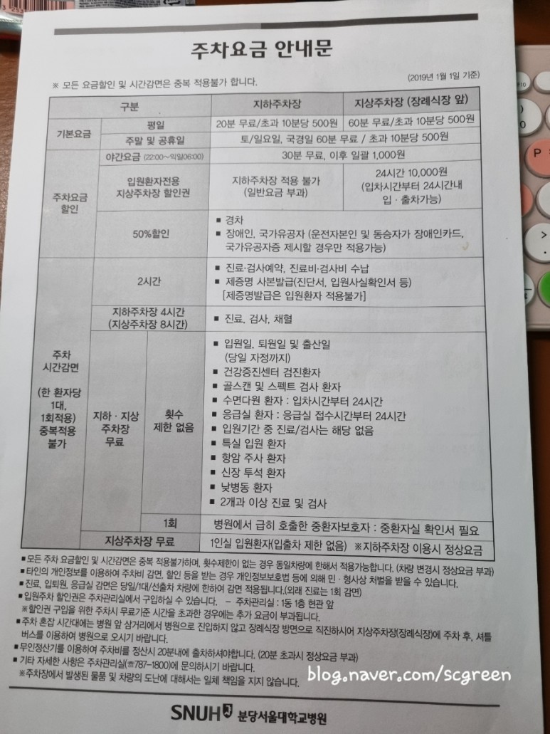 분당서울대병원 주차비는 아래와 같다 (*2019년 1월 1일)
