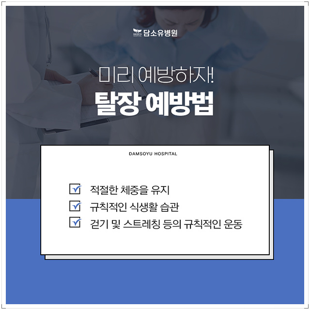 해당 질환을 예방하기 위해서는 운동하고 복부 주변의 근육, 근막조직을 강화하여 무거운 물건은 되도록 들지 않습니다. 또한 변비 등 복부 압력을 높이는 요인을 개선하여 금연이나 심한 기침감기 등 호흡기 질환의 예방과 관리가 필요하다고 할 수 있습니다.