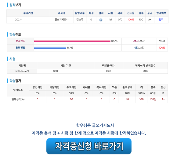 자격증을 취득하기 위한 점수가 있는데 저는 무사히 통과했습니다수강진도와시험점수의합계로통계가나왔는데A+100점으로시험을통과했어요.너무 기뻤어요^^!