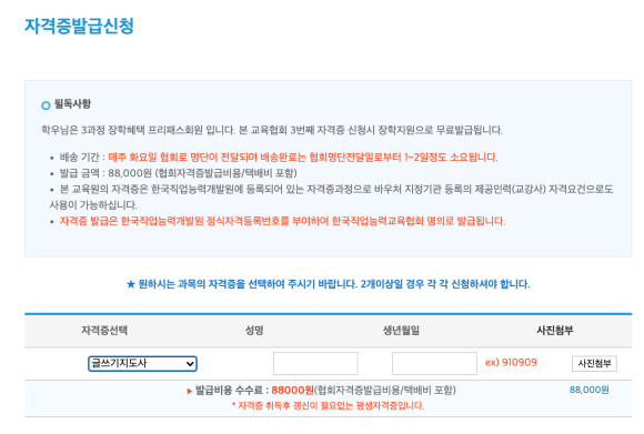 자격증 무료과정을 듣고 시험본 자격증을 선택하세요.그리고 이름과 생년월일을 작성해서 받아쓰기 지도사 1급 자격증 용 사진을 첨부하면 끝입니다.